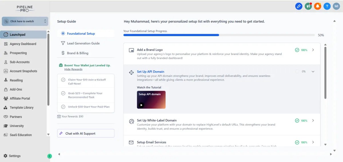 Your full system build, personalisation, automations, workflows, customer import, testing, and activation.